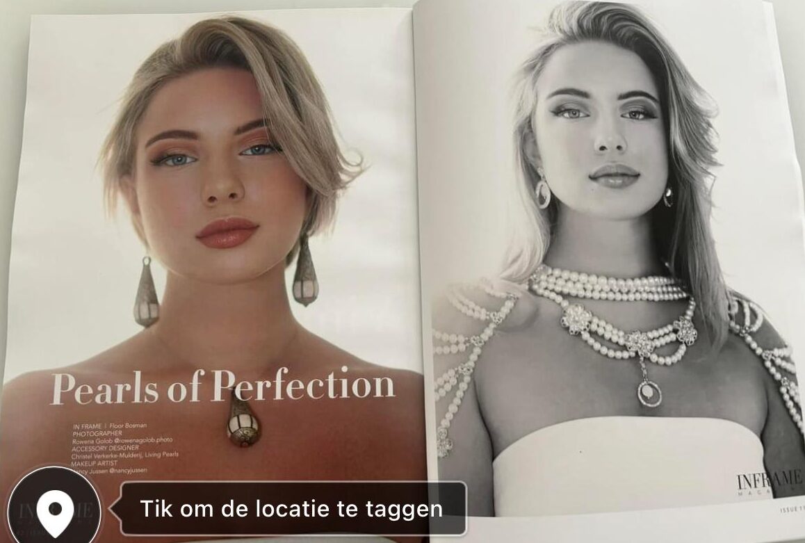 Floor draagt een mooie parelset van armband, ketting en oorbellen.